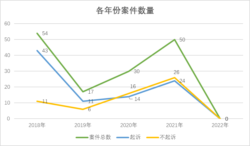 在151起案件中,各年份的案件数量分别是:2018年54起,其中:起诉的43起,不起诉的11起;2019年17起,其中:起诉的11起,不起诉的6起;2020年30起,其中,起诉的14起,不起诉 16起;2021年50起,其中:起诉的24起,不起诉的26起;2022年0起。